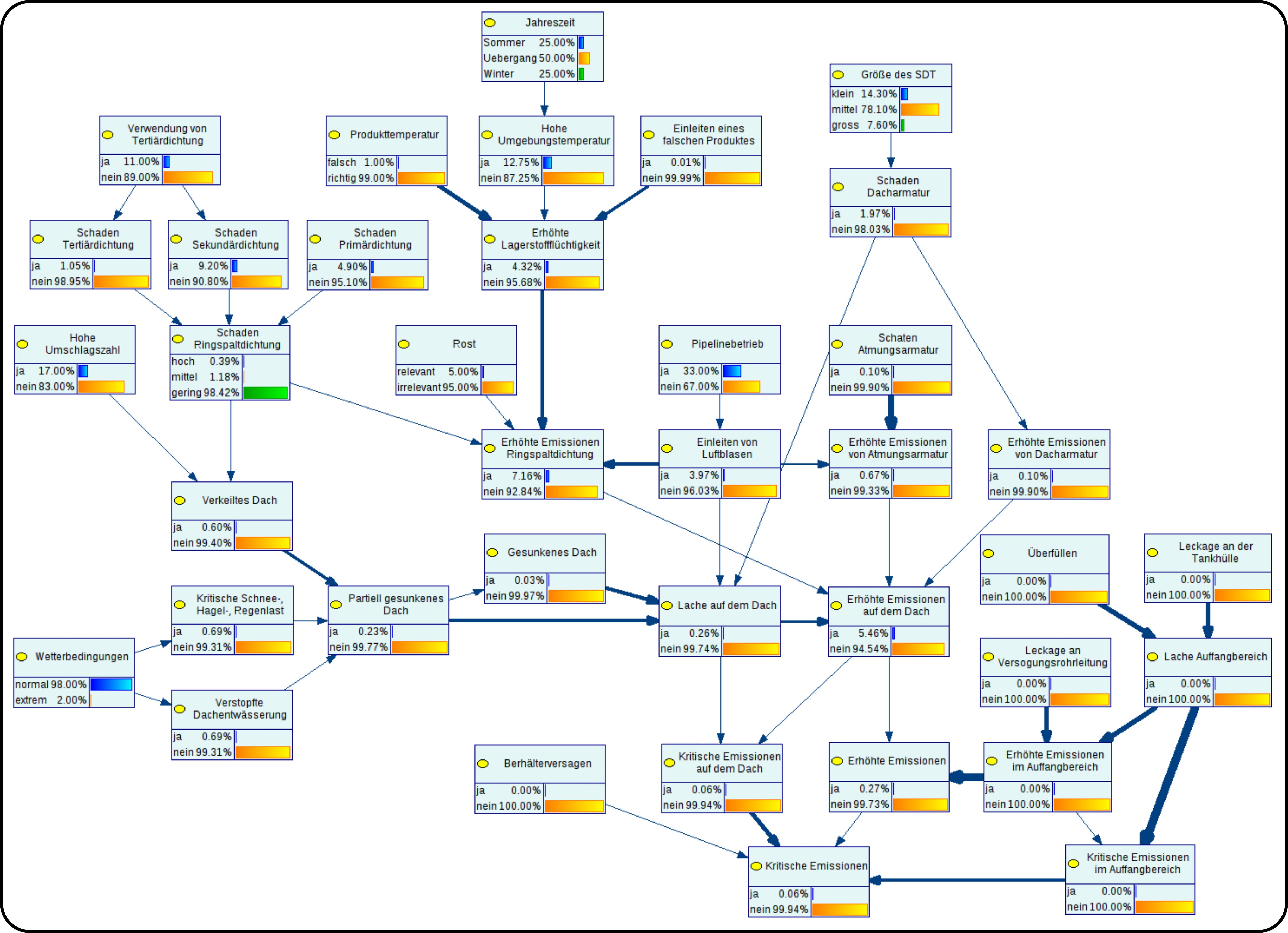 Zunächst wurde recherchiert, welche Schadensereignisse und Häufigkeiten in der Literatur publiziert wurden. Diese Datenlage wurde durch eine deutschlandweit durchgeführte Betreiberumfrage und eine gezielte Expertenbefragung merklich verbessert. Zusätzlich wurden die Tankdaten von etwa einem Viertel aller Tanks erfasst, wodurch die Umfrage ein statistisch repräsentatives Bild liefert. Mit Hilfe von Modellen zur Emissionsabschätzung und unter Verwendung von Ausbreitungssimulationen wurde ermittelt, welche Schadenszenarien in Emissionen münden können, die für die Herausbildung gefährlicher explosionsfähiger Atmosphären hinreichend sind. Hierfür war es erforderlich, für alle Ereignisse plausible Bandbreiten für Quellmassenströme zu bestimmen, die sowohl unterschiedliche Tankbauweisen, unterschiedliche Betriebsweisen, unterschiedliche Lagerstoffe und die Vielzahl beobachteter Schäden abdecken, inklusive Fehlerbetrachtungen. Als Ausbreitungsmodelle wurden CFD-Ausbreitungssimulationen und Partikeltrajektorienmodelle verwendet und mit Windkanalmessungen verglichen. Die Eintrittswahrscheinlichkeiten dieser Ereignisse wurden erhoben und innerhalb einer quantitativen Risikoanalyse auf der Grundlage Bayesscher Netze miteinander kausal verkettet. Für die Ergänzung fehlender Wahrscheinlichkeitsdaten wurde auf die langjährige Erfahrung von Experten aus der Konstruktion, dem Betrieb und aus der Herstellung von Dichtungssystemen zurückgegriffen.